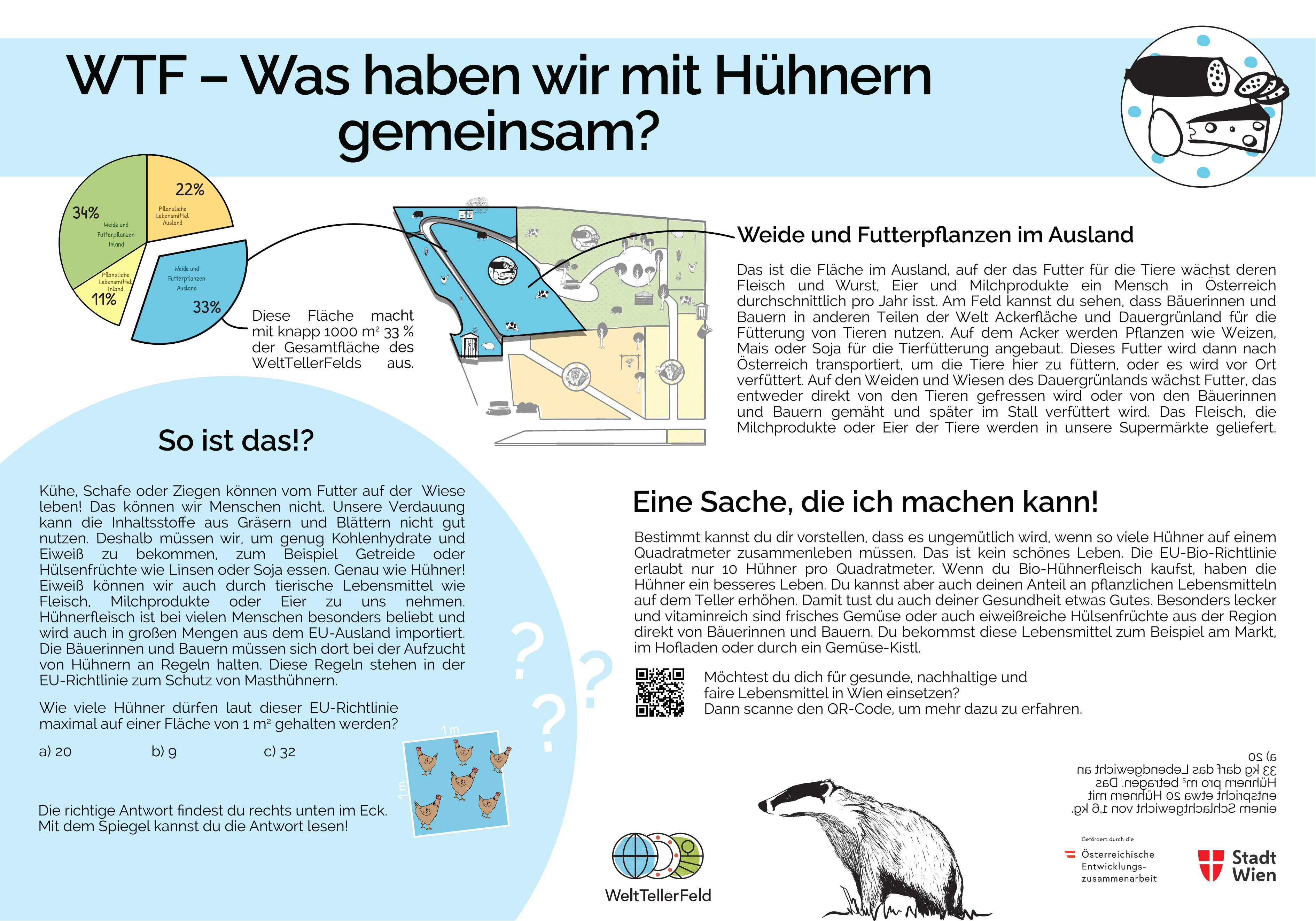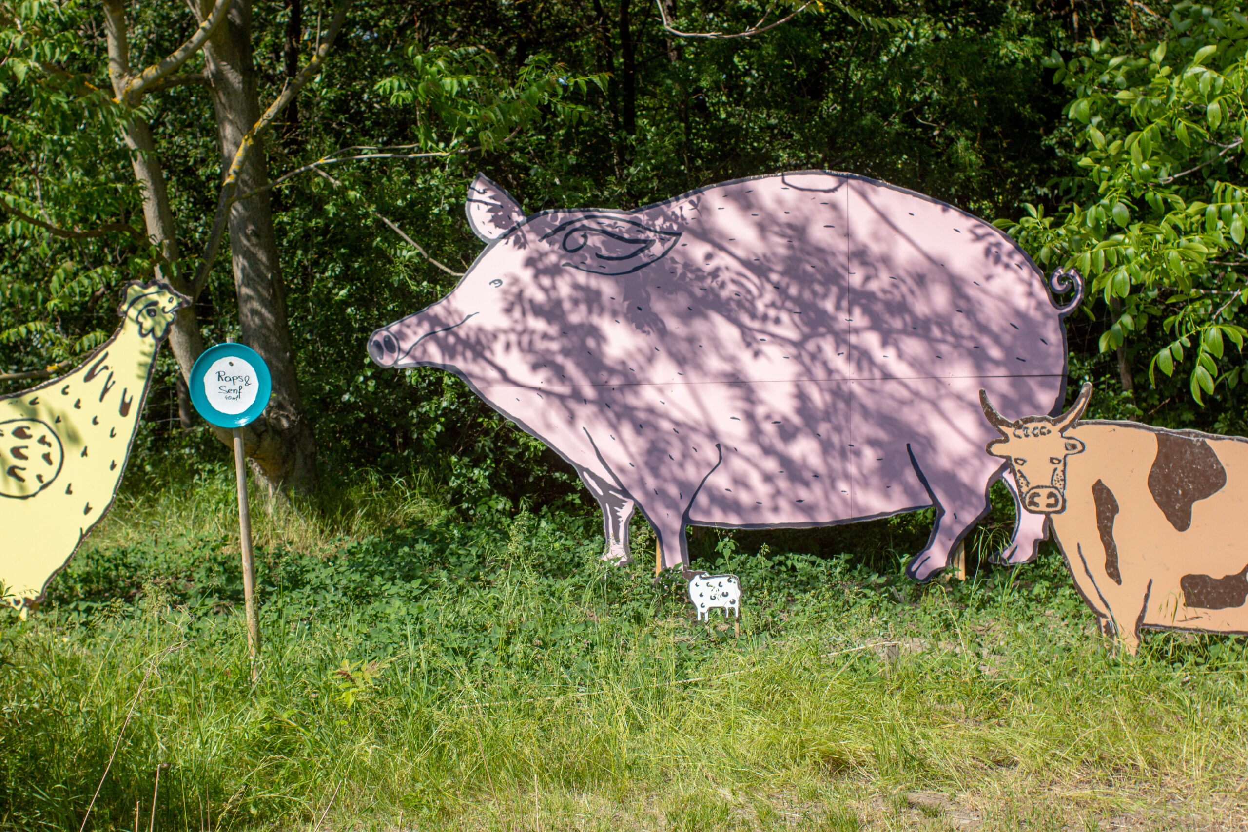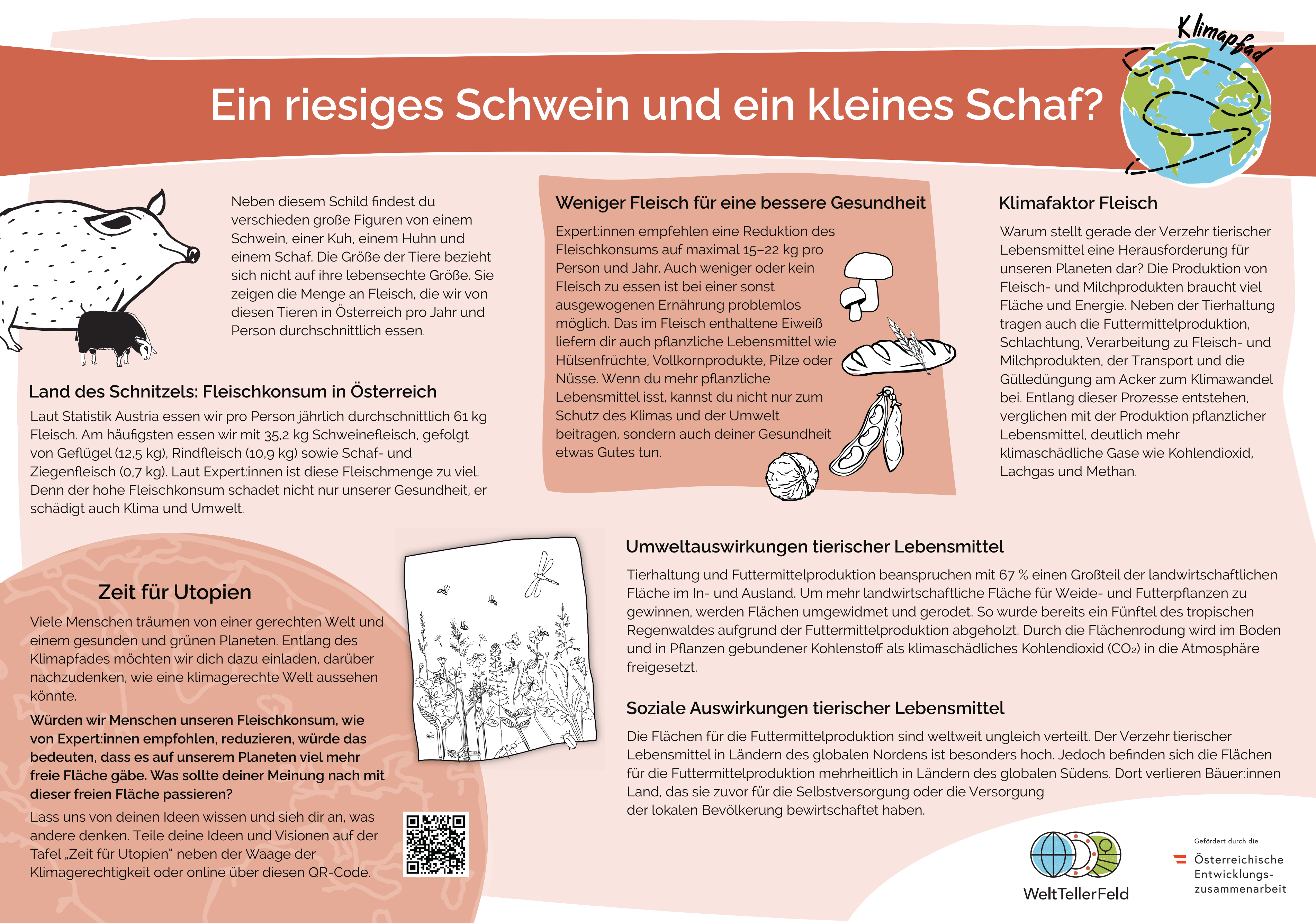 Neben diesem Schild am WeltTellerFeld findest du verschieden große Figuren von einem Schwein, einer Kuh, einem Huhn und einem Schaf. Die Größe der Tiere bezieht sich nicht auf ihre lebensechte Größe. Sie zeigen die Menge an Fleisch, die wir von diesen Tieren in Österreich pro Jahr und Person durchschnittlich essen.