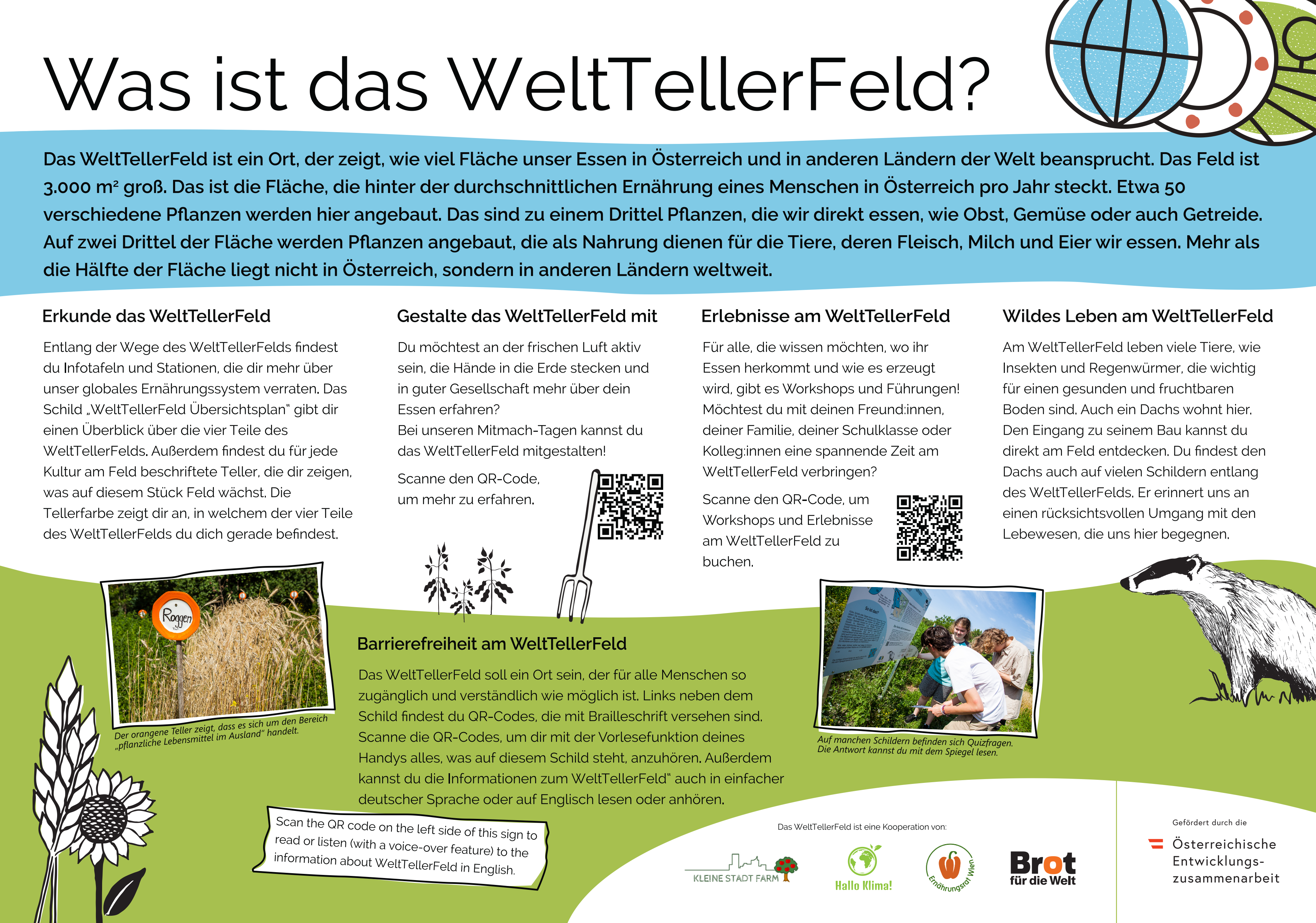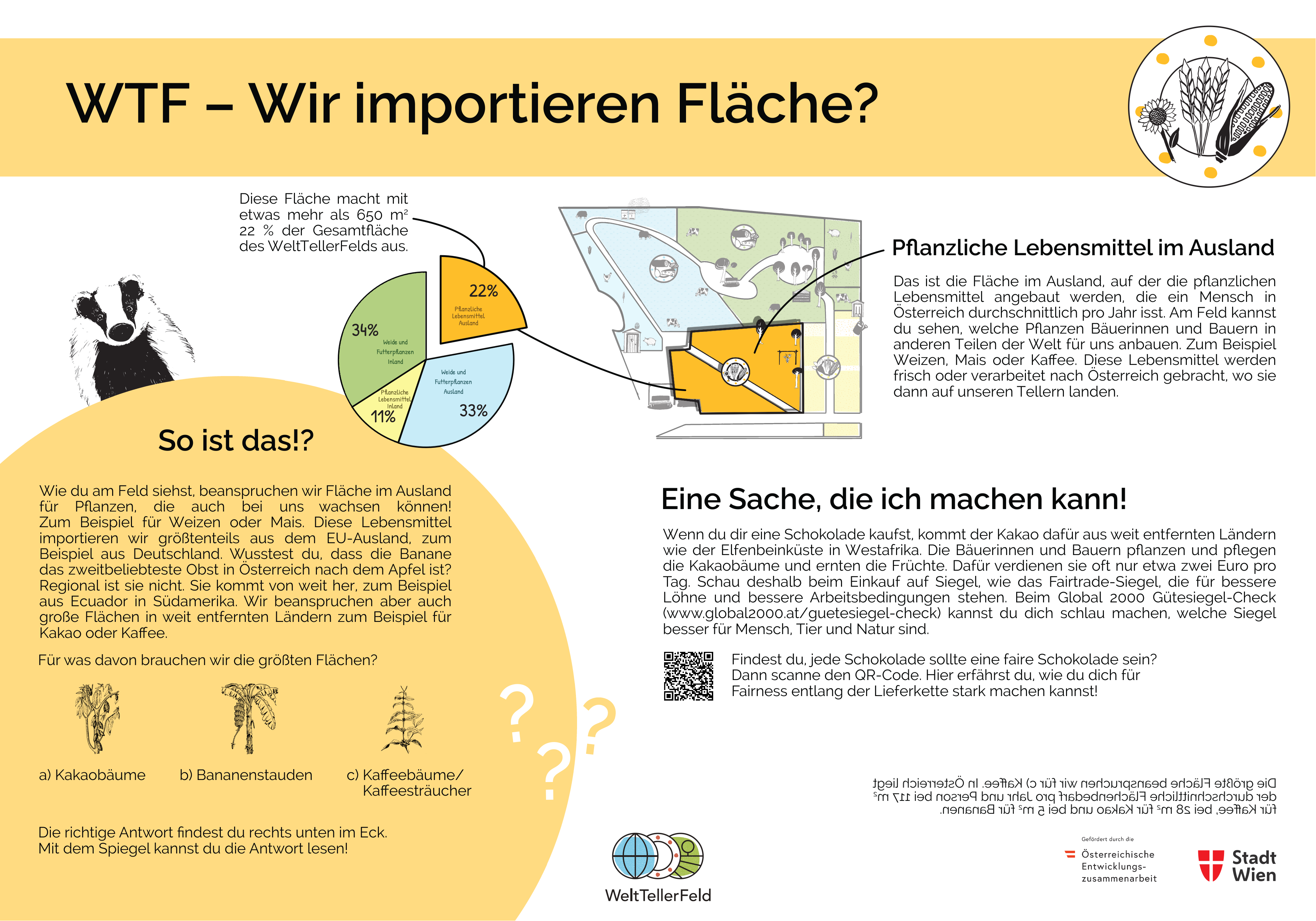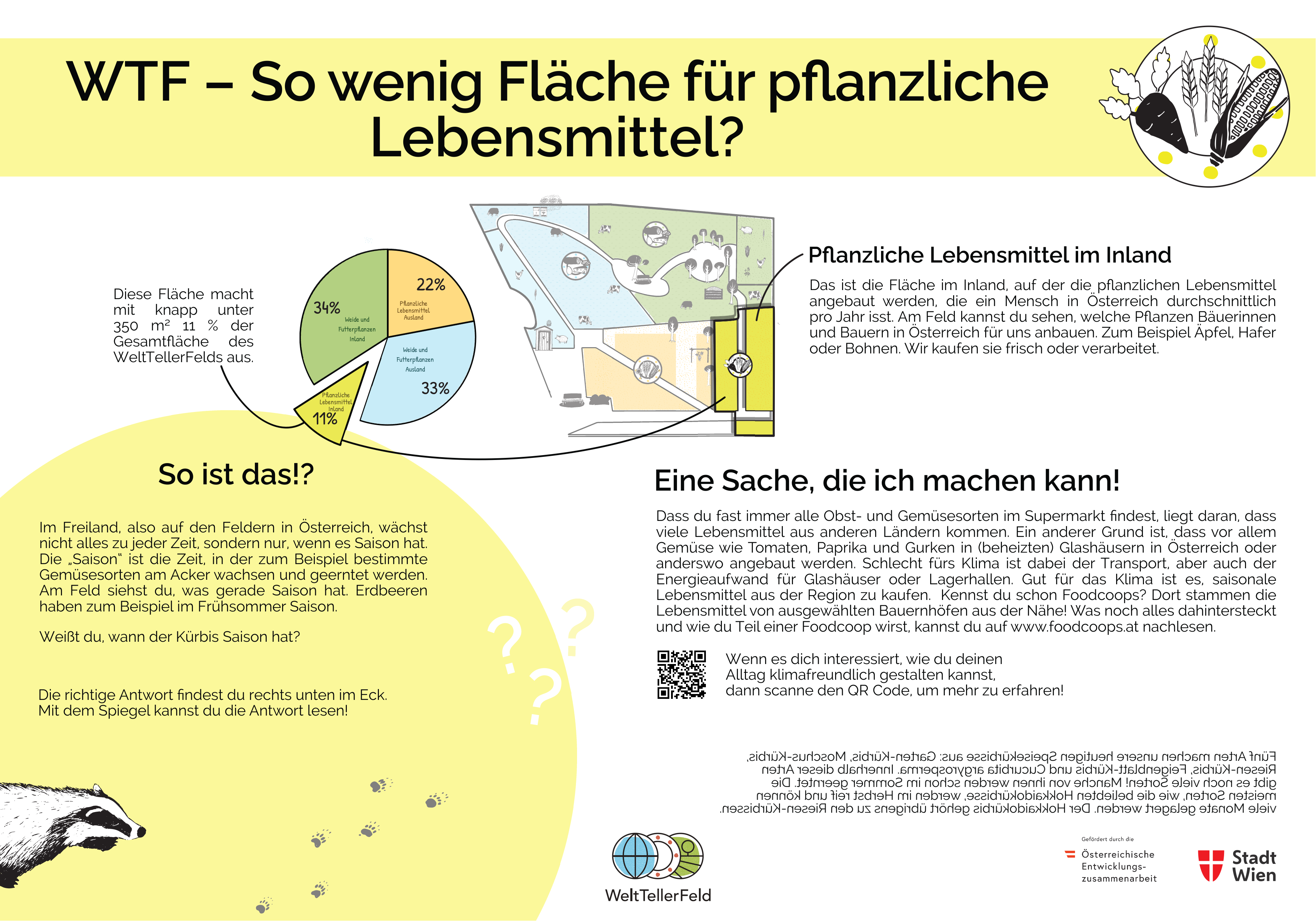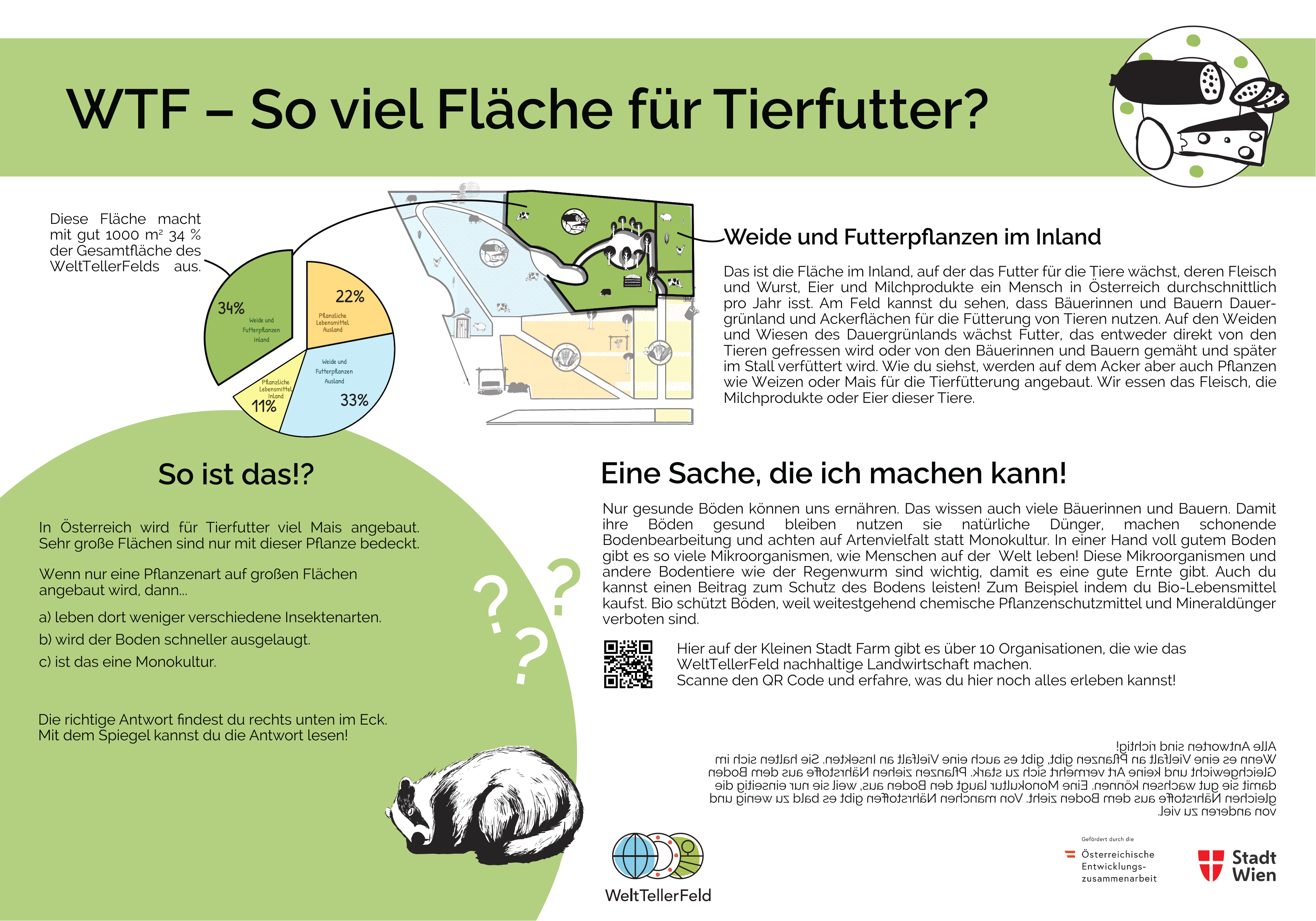 Neben diesem Schild am WeltTellerFeld findest du verschieden große Figuren von einem Schwein, einer Kuh, einem Huhn und einem Schaf. Die Größe der Tiere bezieht sich nicht auf ihre lebensechte Größe. Sie zeigen die Menge an Fleisch, die wir von diesen Tieren in Österreich pro Jahr und Person durchschnittlich essen.