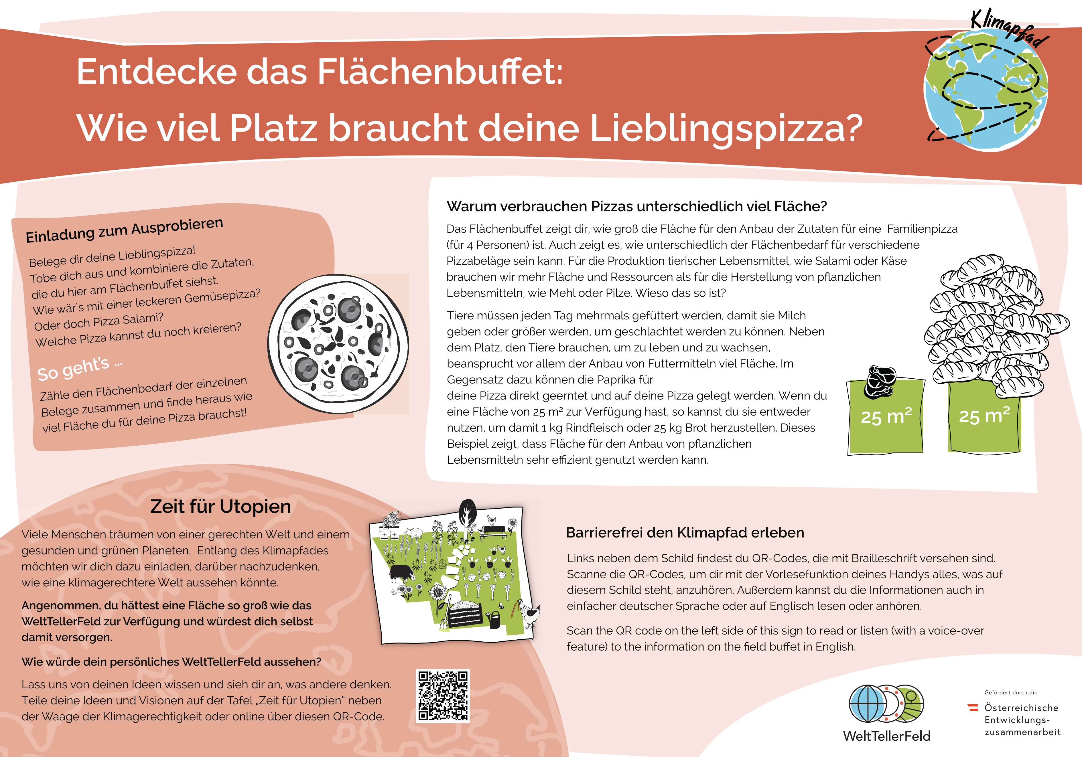 Das Flächenbuffet zeigt dir, wie unterschiedliche groß die Flächen für den Anbau verschiedener Zutaten für eine Pizza sind. Probiere es aus, indem du deine Lieblingspizza gedanklich belegst und verschiedene Zutaten kombinierst. Zähle den Flächenbedarf der einzelnen Belege zusammen und finde heraus wie viele m2 Fläche du für deine Pizza brauchst!