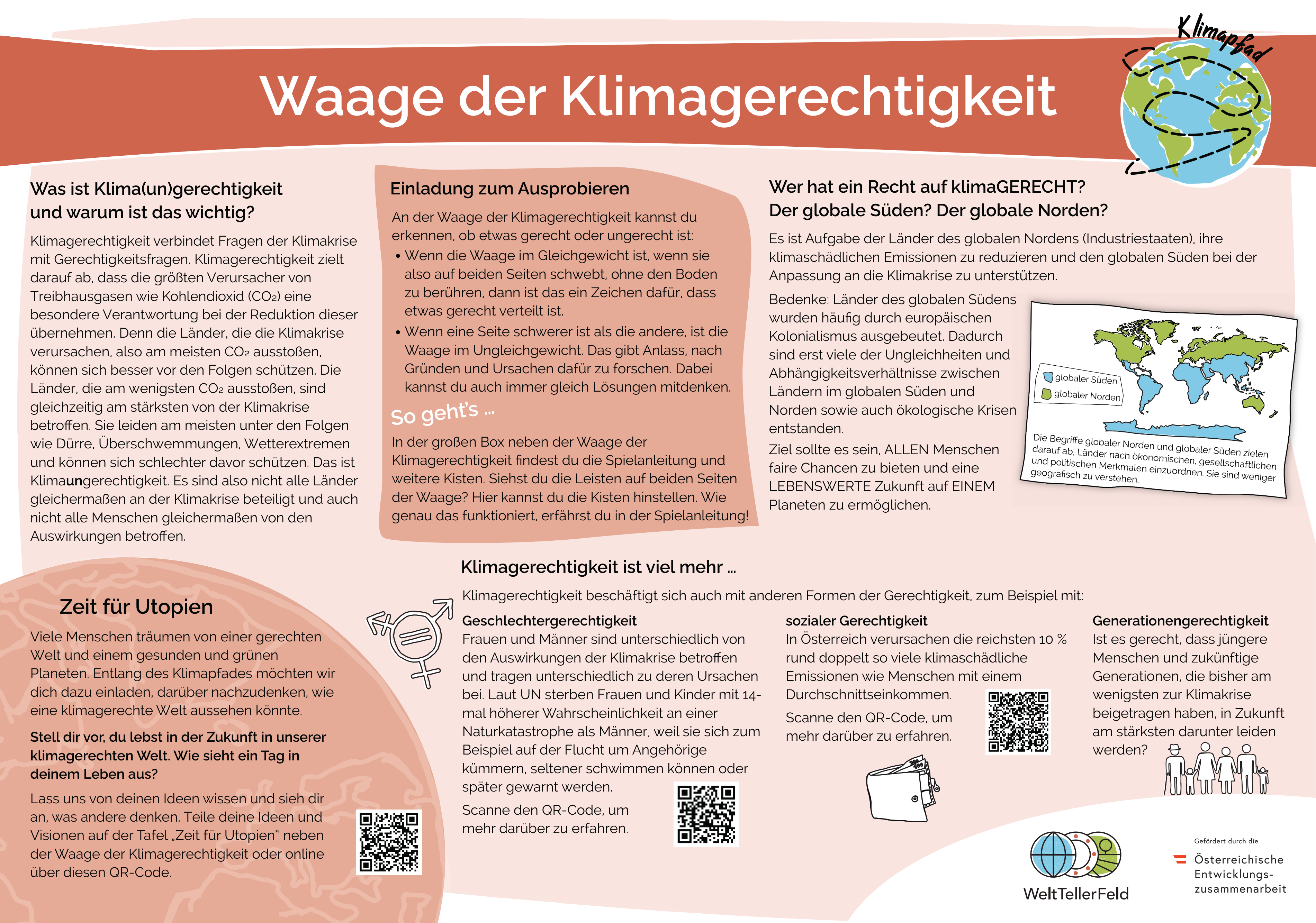 An der Waage findest du eine Tafel mit Informationen zu Klimagerechtigkeit und was dieser Begriff beinhaltet und verbindet. Du kannst spielerisch herausfinden, ob es etwas gerecht oder ungerecht ist.